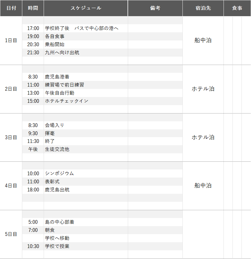 ちなみに、これが遠征のスケジュールです。自分は全然知らなかったんですけど、書道の大会って揮毫(きごう)大会っていうんですね。筆をふるう、って意味らしいです。
