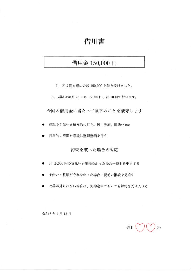 ただ、借用書には自宅での生活態度についても書くように言ったんです。最近生活が乱れまくってて嫁さんに叱られてばかりだったので。