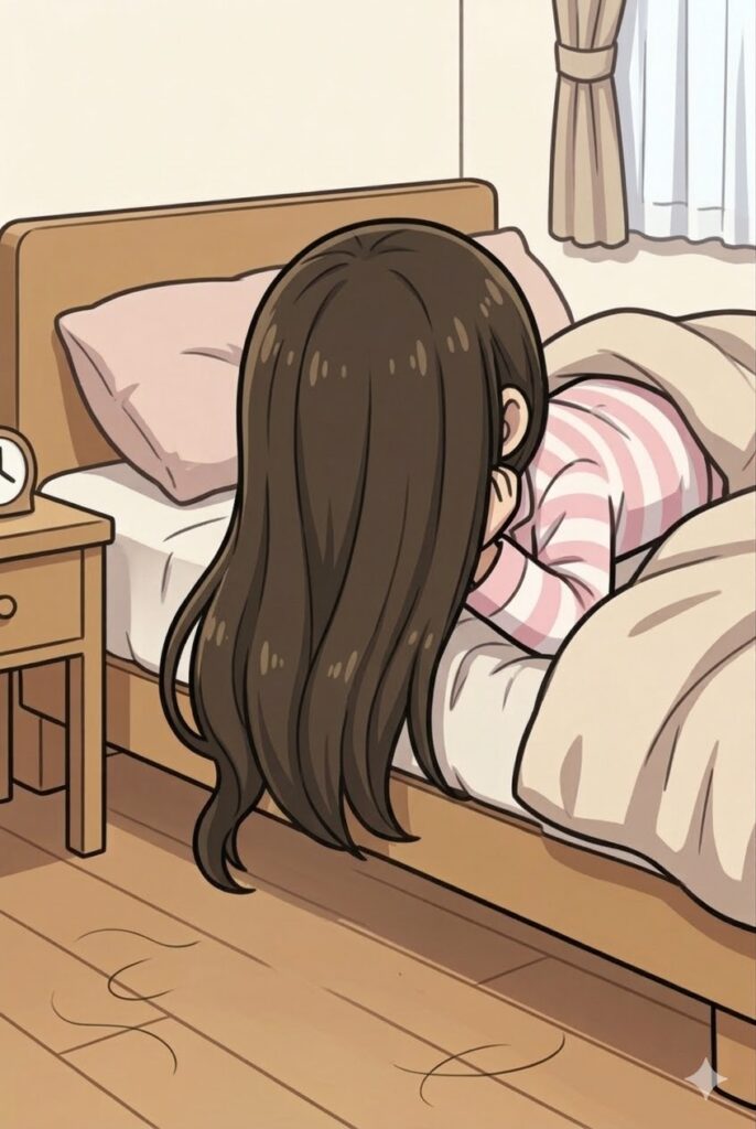 ベッドから半身を乗り出して床にキラキラ途中のRさんを発見しました。