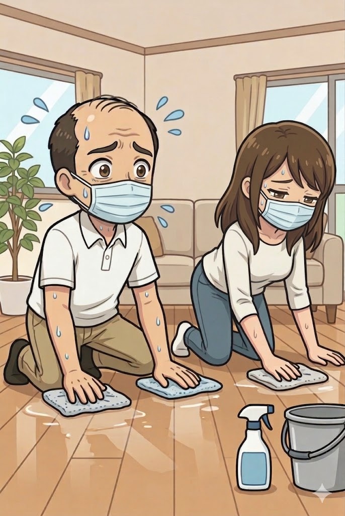 で、念のため次亜塩素酸の希釈液を作って、夜中のリビングで嫁さんと二人で床掃除をしたんです。